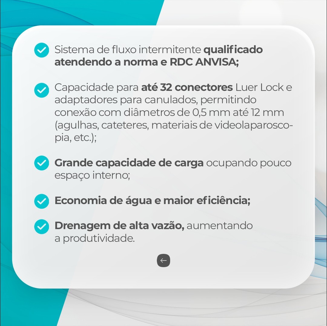 Com registro na Anvisa, o equipamento foi projetado conforme os requisitos da ABNT NBR 17130-1 e da RDC 15/2012, oferecendo um processo seguro e padronizado de limpeza, inclusive para instrumentais canulados de uso cirúrgico e minimamente invasivo.